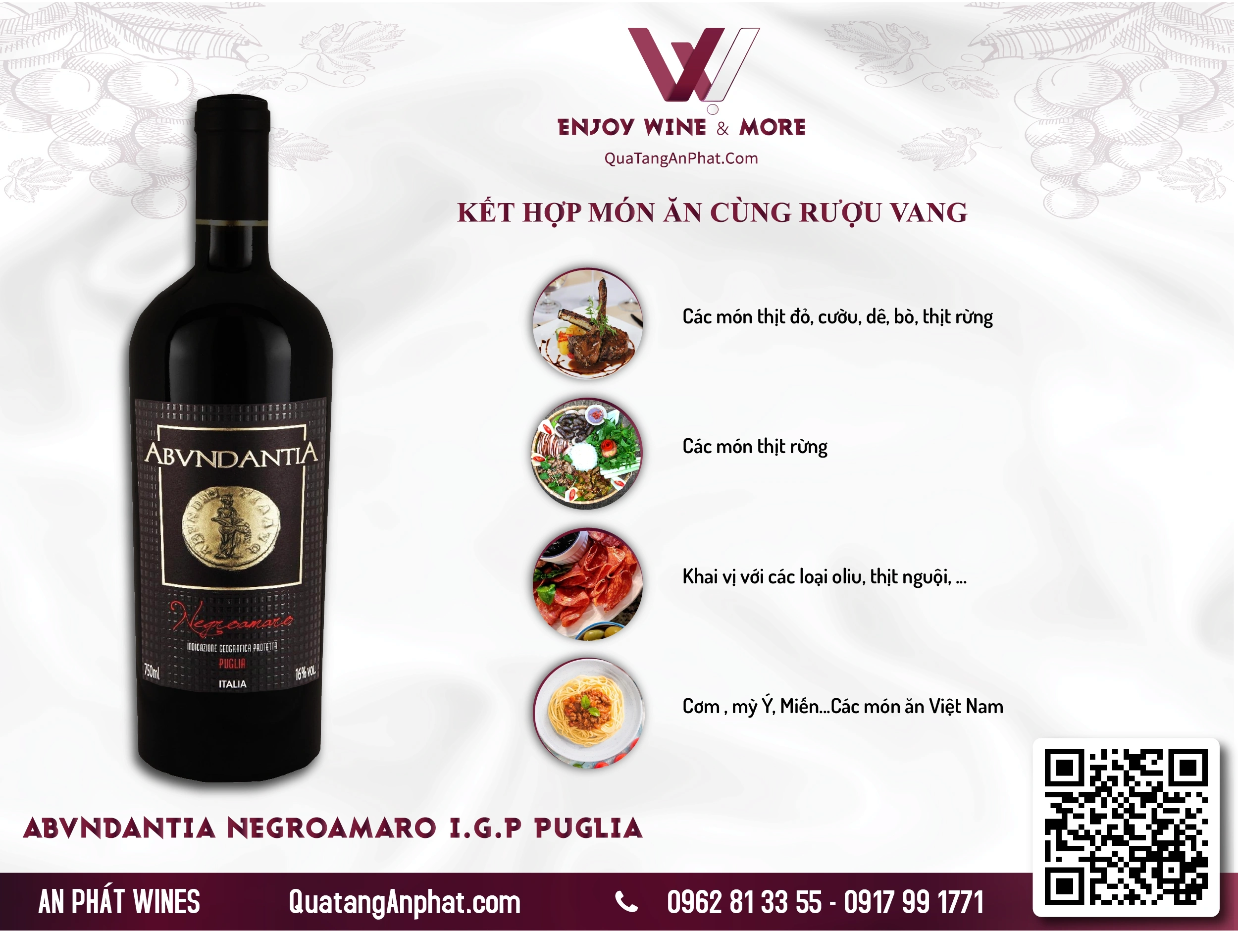 Kết hợp món ăn phù hợp với Rượu vang đỏ organic Abvndantia Negroamaro I.G.P Puglia Italy 750ml 15,5%