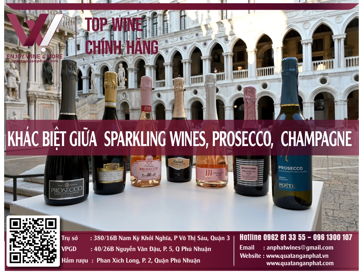 Champagne,sparkling wines và Prosecco là một loại rượu vang sủi tăm , có hình thức như nhau nhưng khác biệt về cách sản xuất và chất lượng, xuất xứ .