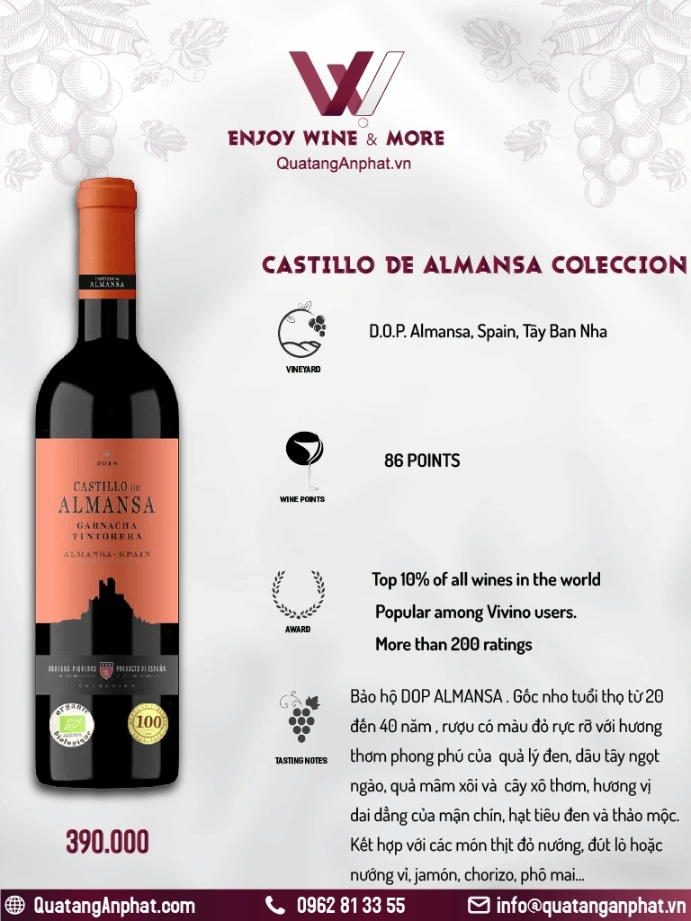 Rượu vang đỏ Organic Piqueras Castillo De Almansa Coleccion tinto Spain 750ml 14%
